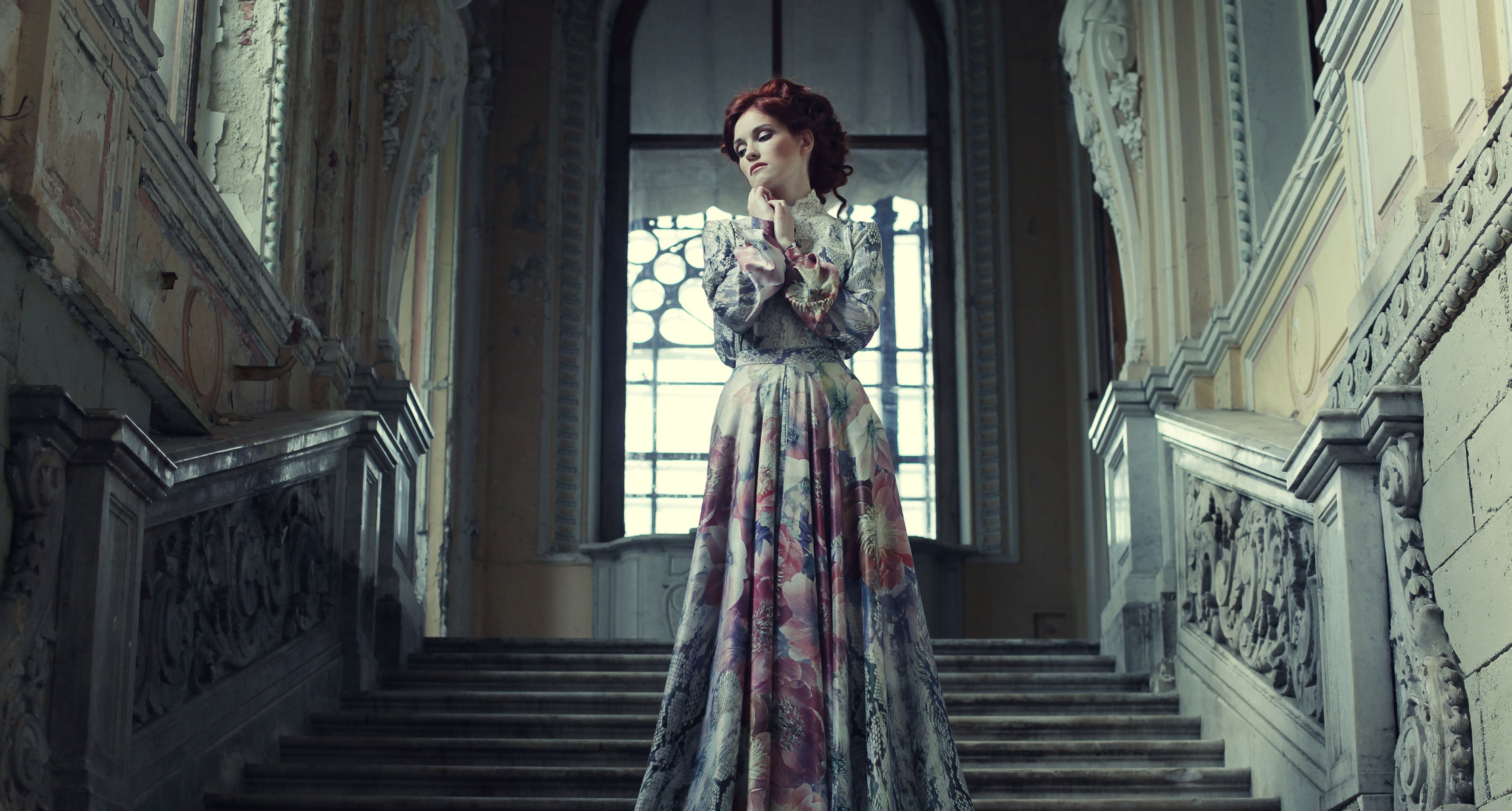 Она выполнена на двуцветной основе в технике многослойного рисунка и имитирует старинный жаккард, с проступающим классическим вензелем. Блестящая вискозная нить, входящая в состав ткани, придает ей лёгкое благородное сияние.